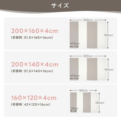 | サイズと価格 (厚さ1.35cm) | 120×160:10,900円 200×140:15,800円 160×200:18,800円 180×200:19,800円 |